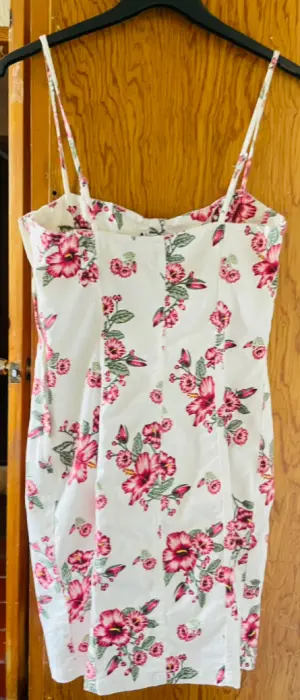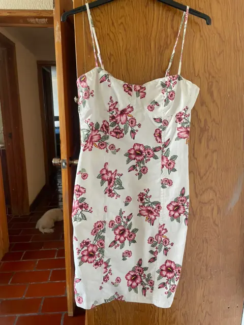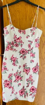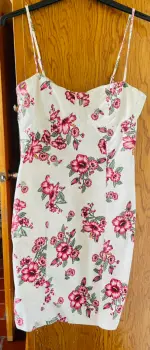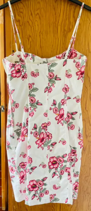 Vestido blanco con flores. Llega a la rodilla y es entallado al cuerpo. Cuenta con tirantes ajustables.