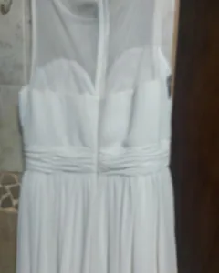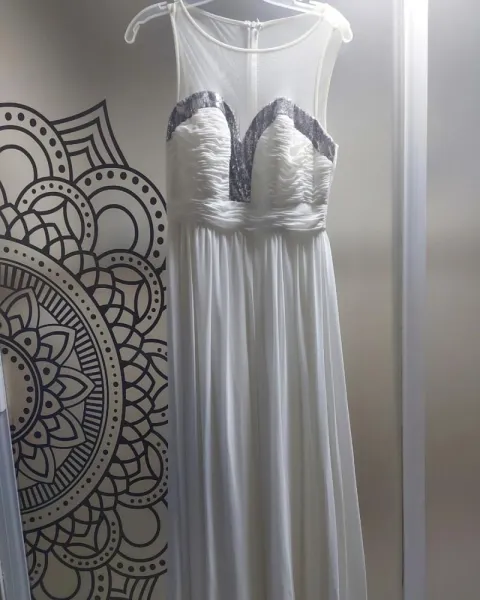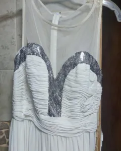 Vestido blanco con plateado. Vestido blanco con pedrería moderna plateada.Escote con malla que lo hace muy cómodo y elegante .