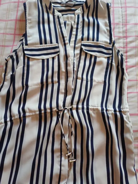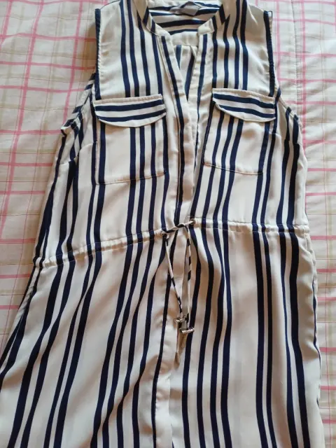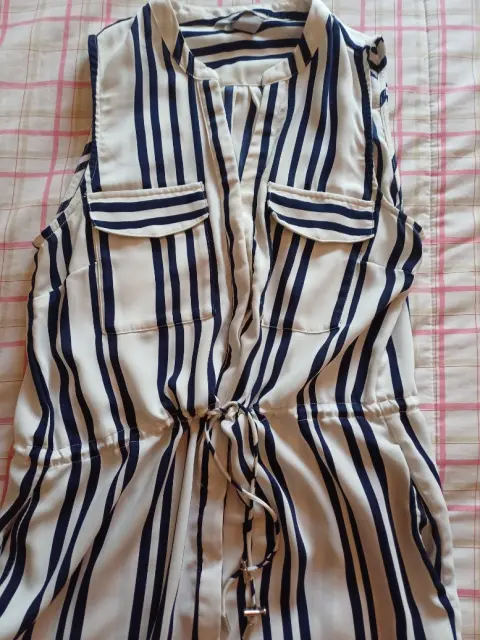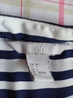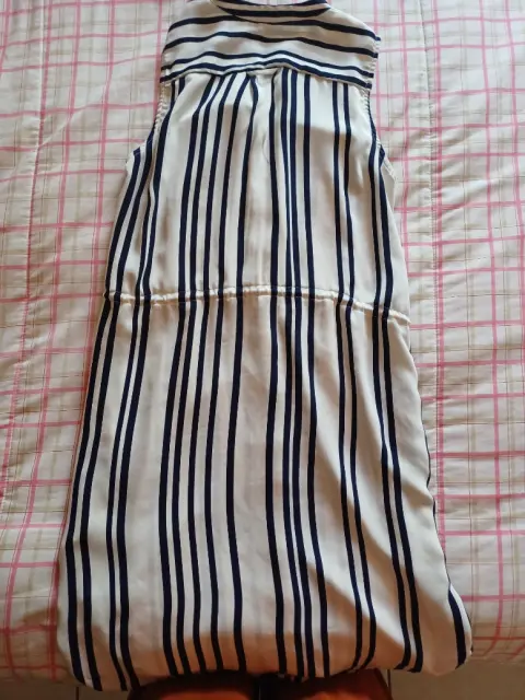 Vestido blanco con rayas azul marino, recto, largo a la rodilla, o mas corto. Marca H@M talla 2