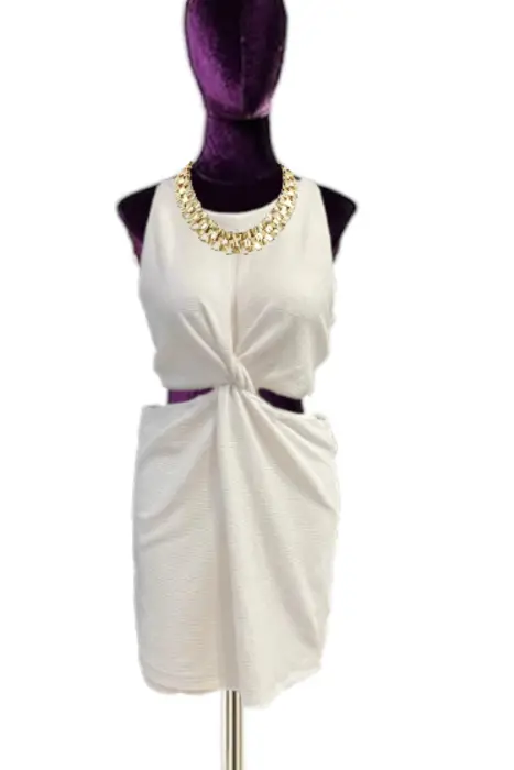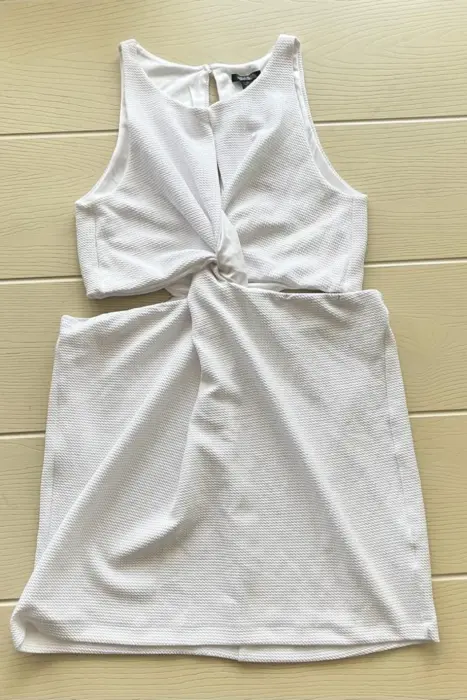 Vestido blanco corto cut out. Vestido blanco corto cut out viene con un boton en la espalda, entrelazado en la parte de alfrente, la tela estira. Es talla xg pero segun el tipo de cuerpo le puede venir a una mediana o grande checar medidas. Se mancho de abajo pero sale con lavada.Medidas:Hombro a hombro:35 cmAxila a axila: 56 cmLargo: 99 cmCadera: 61 cm