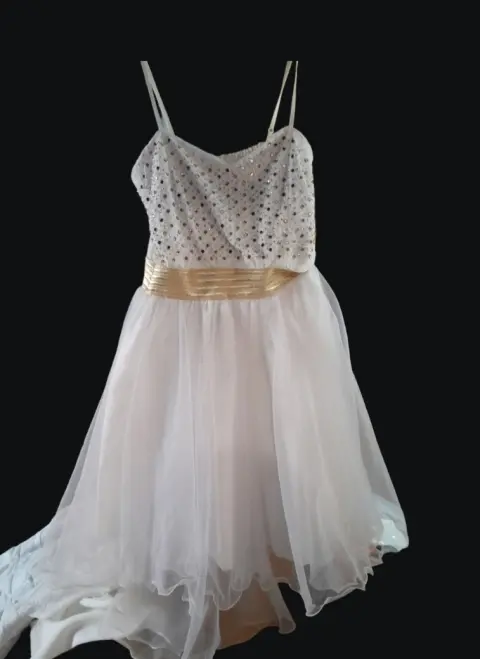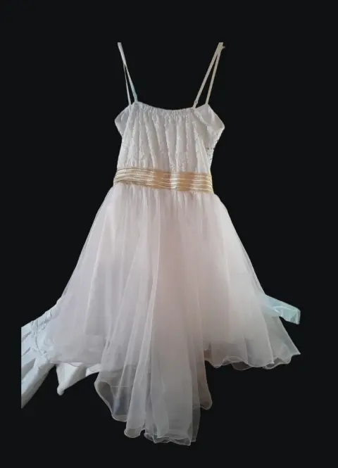 Vestido blanco de confirmación. Vestido doble tela y la última tela semitransparente, de tirantes y aplicaciones color oro, con un poco de cola de pato talla 10
