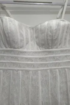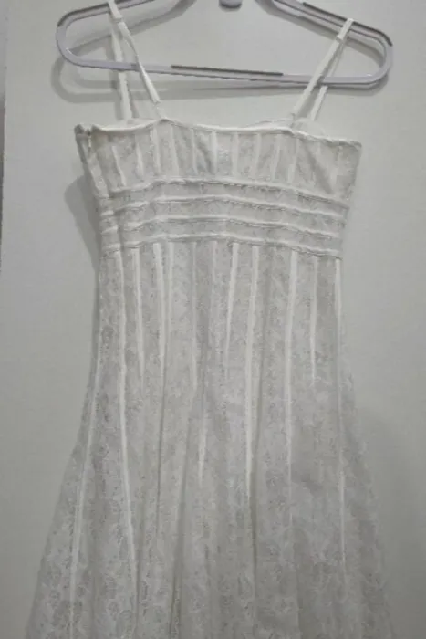 Vestido de tirantes de encaje blanco.Marca CachéViene forrado por dentroCeñido debajo del busto.Cierre al lado.Talla M. Viene reducido.Medidas aproximadas: 38cm de axila a axila,36cm de cintura, 95cm de largo.