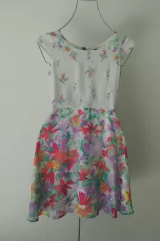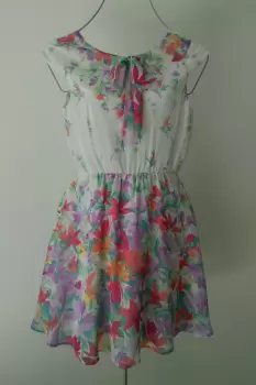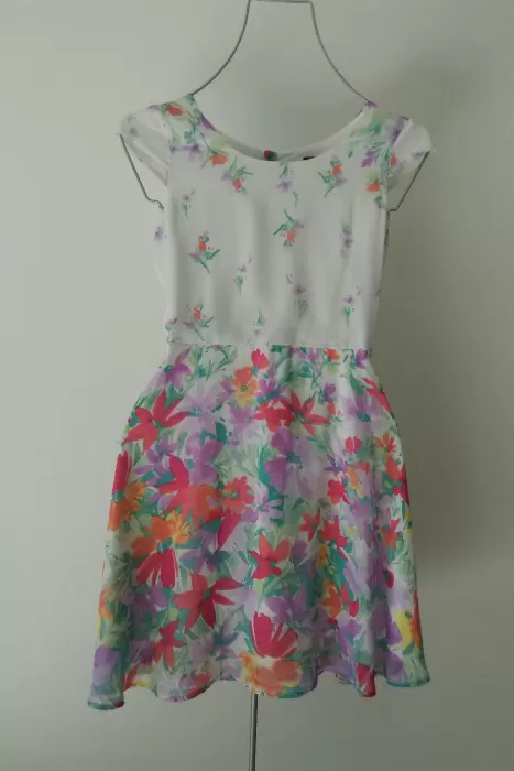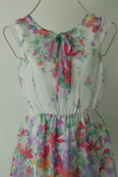 Vestido blanco floral. Hermoso vestido blanco floral marca lilt. Delicado diseño en trla de gasa con estampado de flores en tonos lila y naranja. Con moño en parte de pecho. Con mangas cortas y resorte o elastico en cintura. Con forro.Etiqueta marca talla 16, se ajusta a una talla XS o chica.MedidasPecho 86 cmCintura 70 cm ajusta hasta 80 cmLargo desde hombros 88 cmLargo desde cintura 50 cmEn perfecto estado. Sin detalles.
