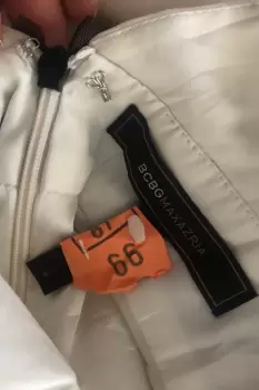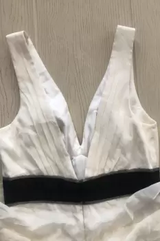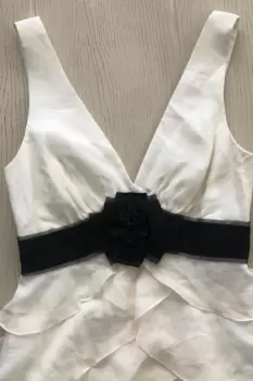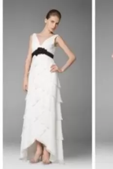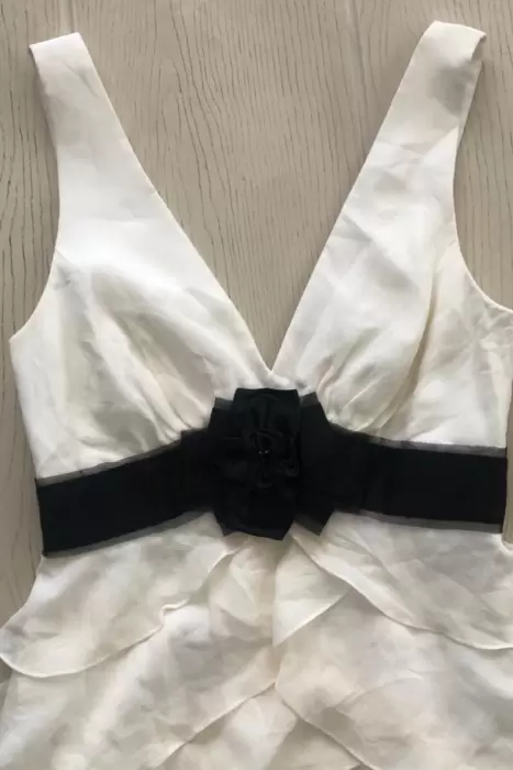 Vestido blanco largo de chifon escalonado con detalle de cinto negro y flor debajo del pecho, viene con cierre en la espalda y broche, tambien puede usarse como vestido de novia, no tiene detalle, solo necesita tintoreria.Medidas:Axila a axila: 44 cmCintura: 84Largo: 145 cm