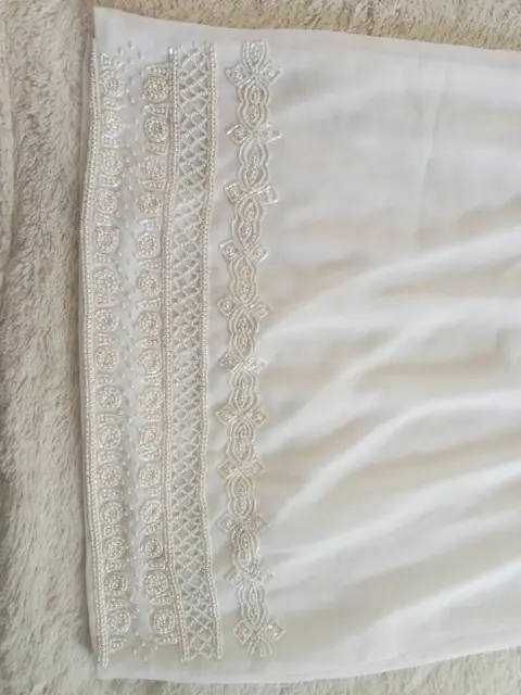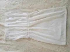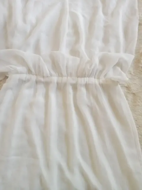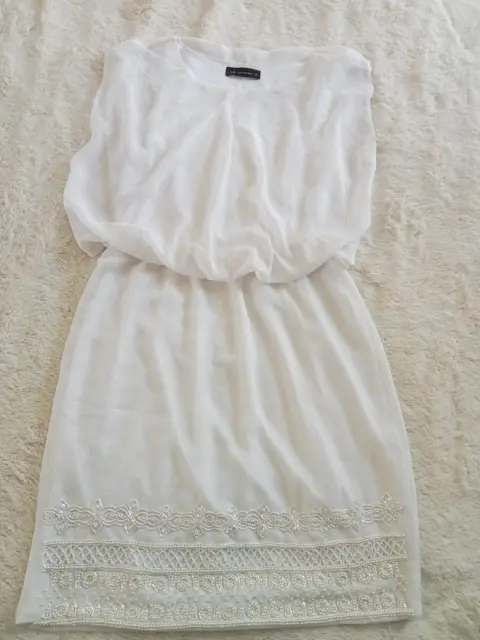 Vestido blanco , marca Lob, talla 2, de manga corta, con forro, transparencia como segunda tela, chaquira en la parte inferior y resorte escondido en la cintura para afinar silueta. Amolda al cuerpo.