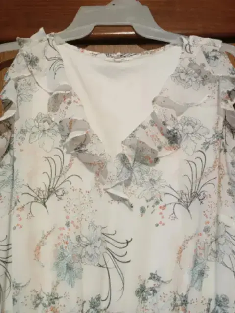 Vestido blanco (casi beige) con estampado floral en tonos gris, azul, menta y coral. Tal y como se ve en las fotosMarca Maurices, talla LEstá nuevo, sin etiqueta