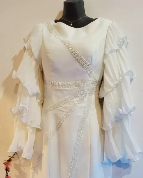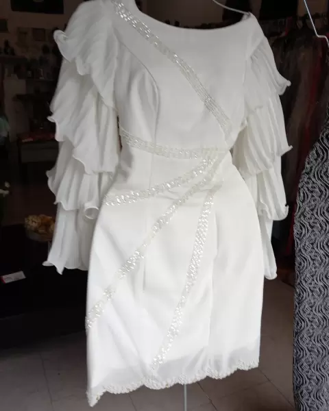 Hermoso vestido blanco para boda civil o evento especial!!Talla chica, bordado en orilla de vestidocon chaquira perla, descubierto en espalda, mangas plizadas en 3 calidad, más que hermoso!!