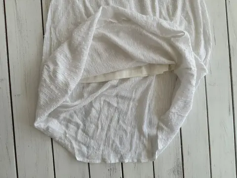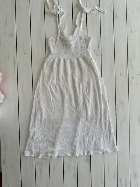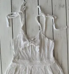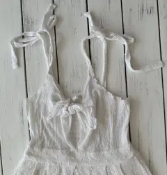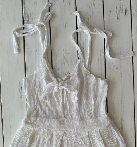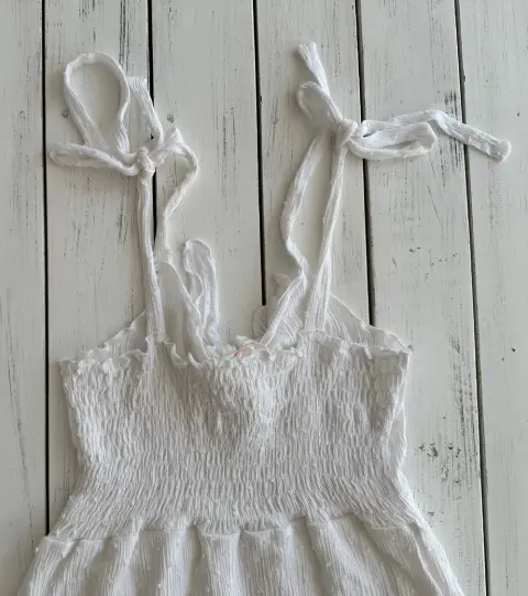 Vestido ligero blanco, talla CHTirantes ajustables, tiene resorte en la espalda para un mejor ajuste, largo abajo de la rodilla, al frente se un nudo al frente para ajustar.No tiene detalles