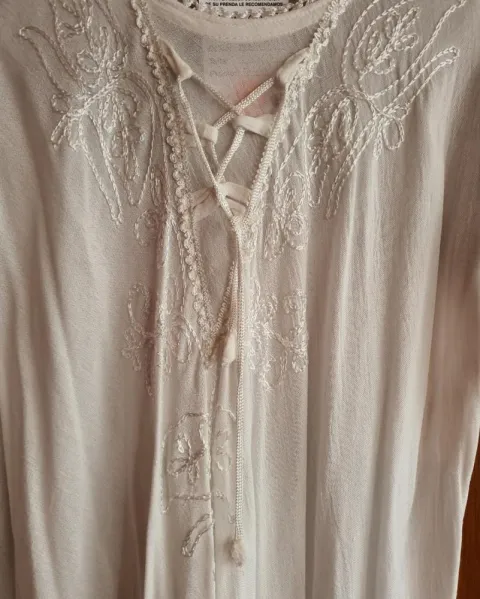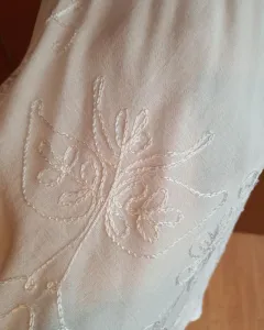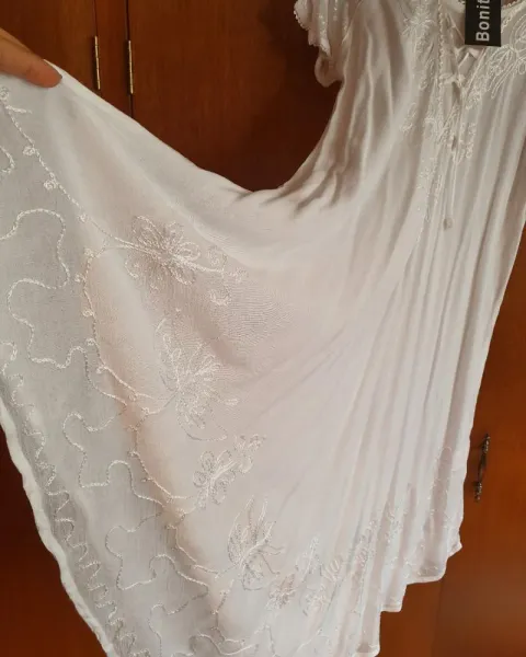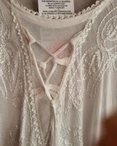 Hermoso vestido blanco con aplicaciones de hilo en forma de flores, las mangas corta tipo encaje, cordones tipo agujetas al frente.
