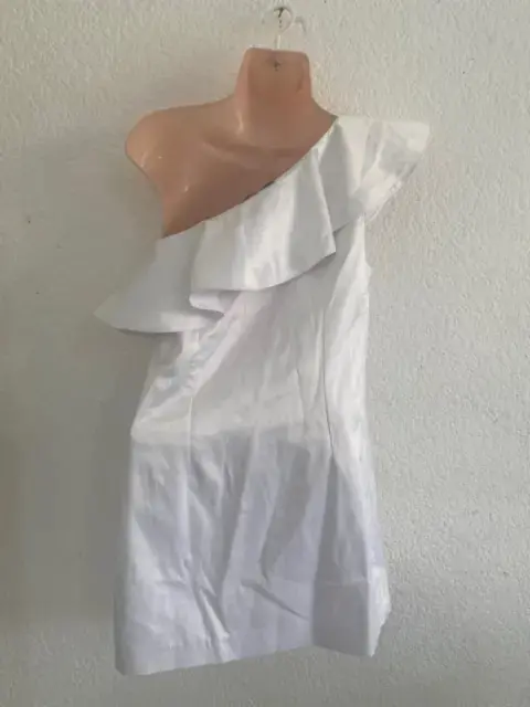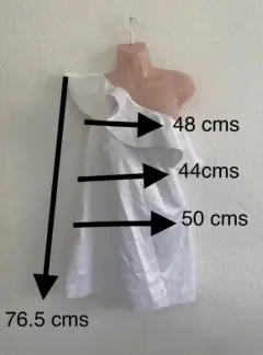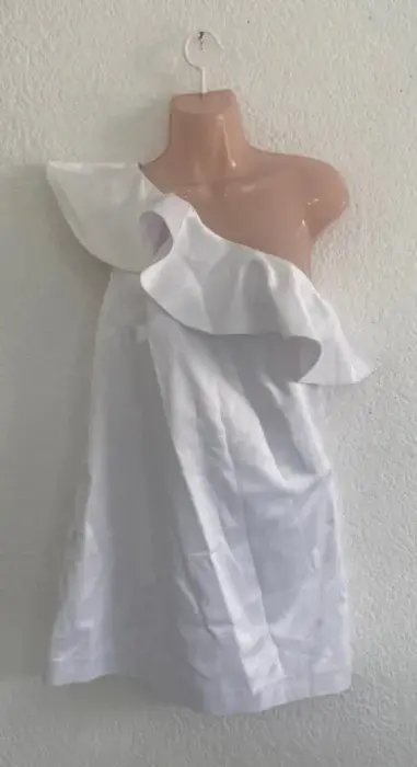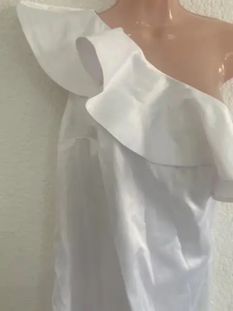 Vestido blanco un solo hombro con volados en el escote y hombro, es suelto y súper fresco para la temporada primavera verano. Es talla S (36)