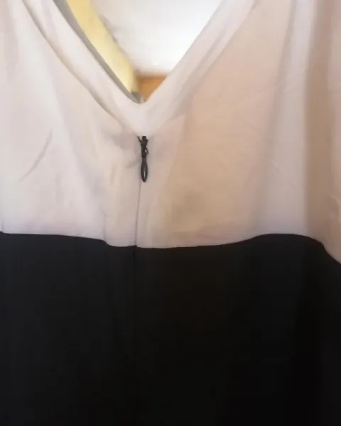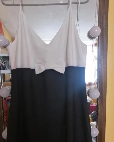Vestido de dos colores blanco y negro. Tela delgada y ligera. Tirantes delgados y escote en V. Detalle de moño delantero. Cierre invisible trasero. No se que marca es. Talla L.Medidas:86 cm bustoCintura: 75 cm cinturaLargo: 39 cm