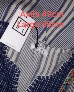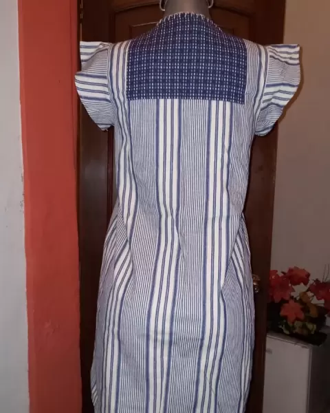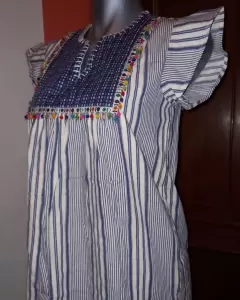 Lindo vestido a rayas, con bordado y pequeños pompones, completamente nuevo.