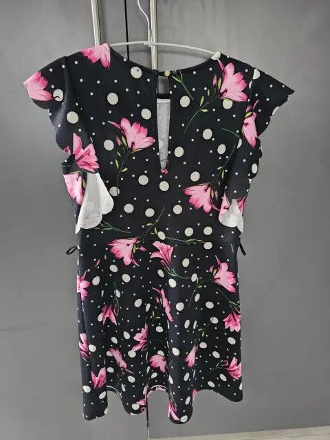 Vestido bolitas y flores. Es un vestido talla chica, para utilizar en el trabajo o coctel. Las medidas son:Busto: 40 cmCintura: 38 cmLargo:80La tela es strecht y tiene buen vuelo.