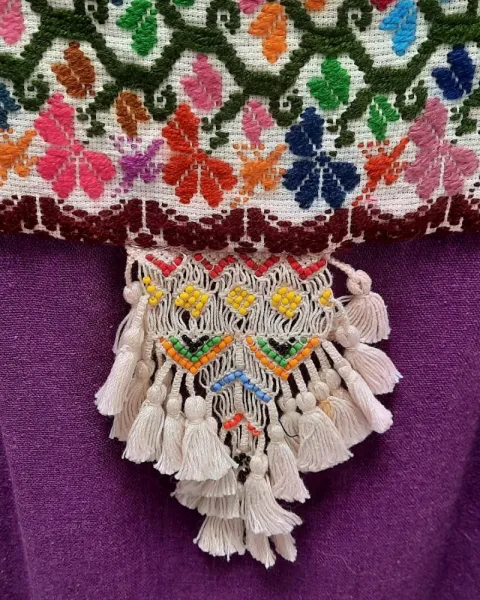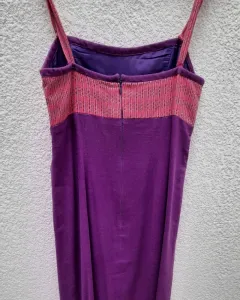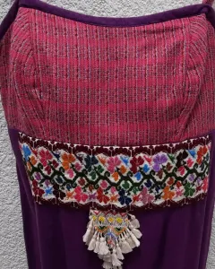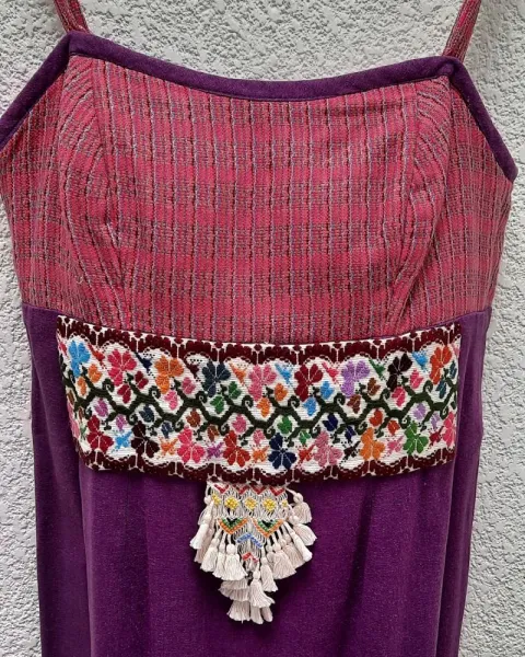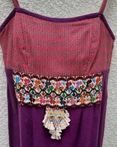 Vestido bordado a mano, de color morado con rosa, 120cm de largo.
