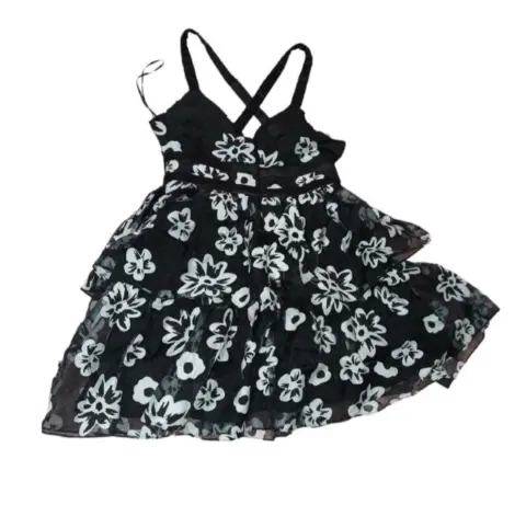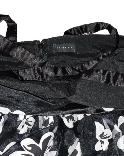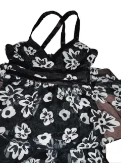 Vestido brunna floreado. Elegante vestido BRUNNA, de tela negra con flores blancas transparente y gorro negro, tiene cierre y tirantes cruzados en la parte trasera, es talla M, se usó 2 veces está en perfecto estado, perfecto para una fiesta