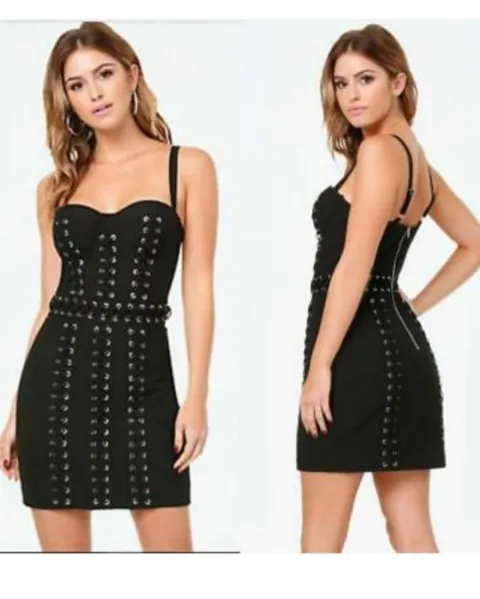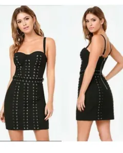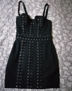 Vestido Corto, Color negro, Talla 4 con ojillos metálicos y entrelazado cintas, de diseño,MEDIDAS:Busto total : 90 cmsCintura total : 72 cms Cadera Total : 94 cmsLargo 84 cmsLa composición de la tela es Crepe, no estira y viene con forro y cierre en la parte de atrás 😍