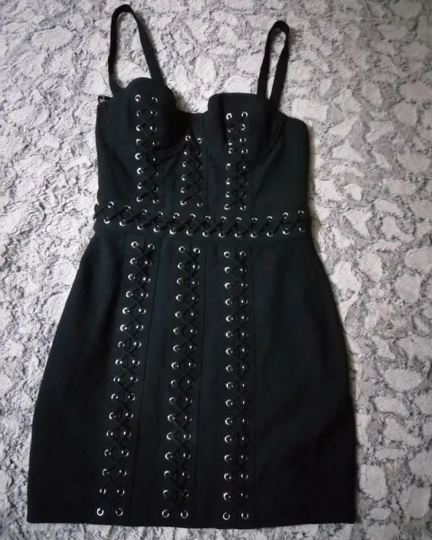 Vestido Bustier de Bebe. Vestido Corto, Color negro, Talla 4 con ojillos metálicos y entrelazado cintas, de diseño,MEDIDAS:Busto total : 90 cmsCintura total : 72 cms Cadera Total : 94 cmsLargo 84 cmsLa composición de la tela es Crepe, no estira y viene con forro y cierre en la parte de atrás 😍