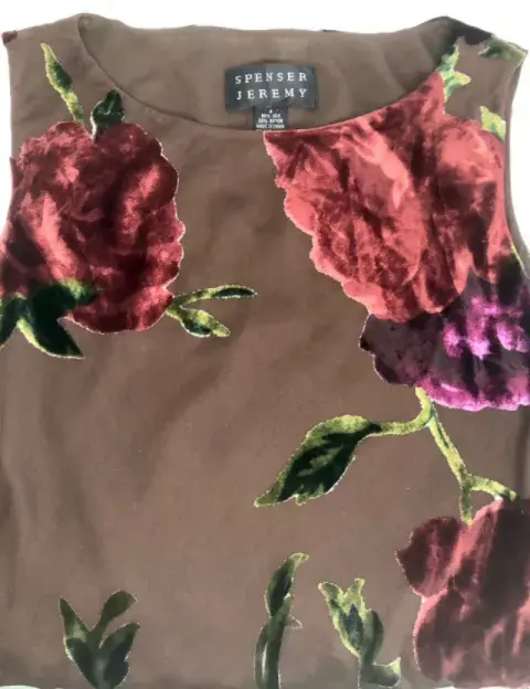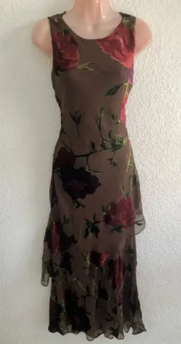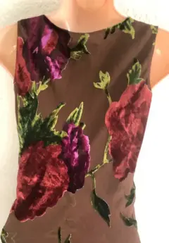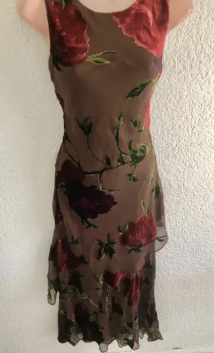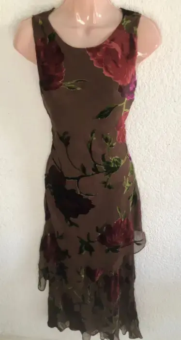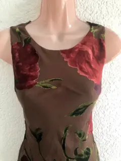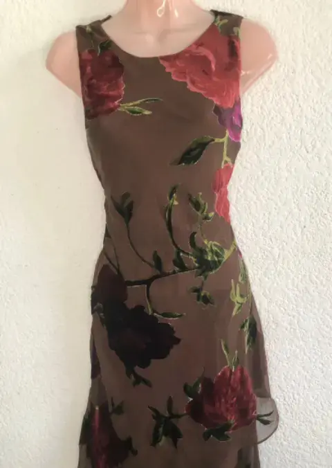 Vestido café sin mangas con flores talla S. Vestido café sin mangas con flores doble capa asimétrico, es 80% seda y 20% rayón, tela semitransparente pero como tiene 2 capa evita que se transparente esta súper lindo y cómodo