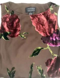 Vestido café sin mangas con flores doble capa asimétrico, es 80% seda y 20% rayón, tela semitransparente pero como tiene 2 capa evita que se transparente esta súper lindo y cómodo