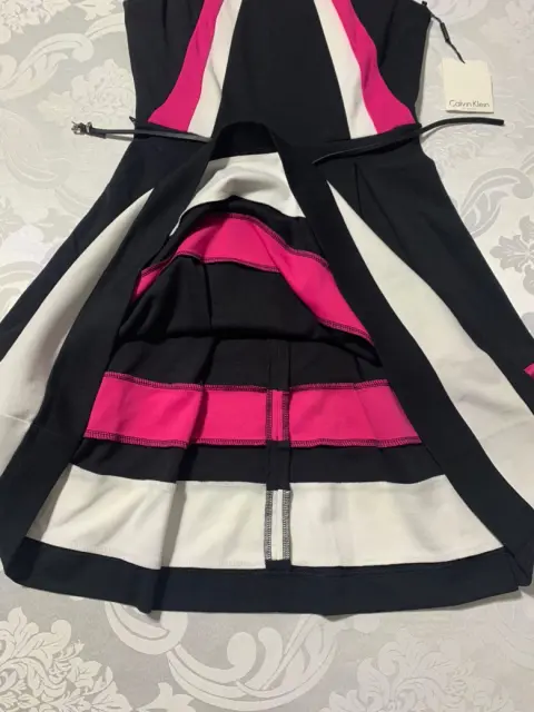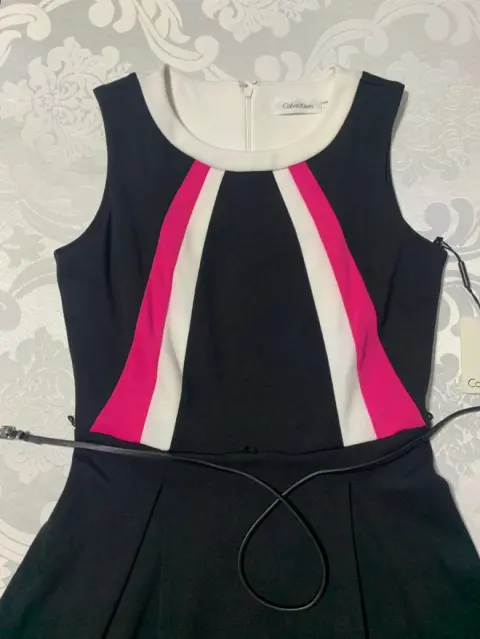 Vestido Calvin Klein. Hermoso vestido corte princesa, sin mangas, cuello redondo, cierre oculto en la espalda y con un delgado cinturón sintético.Tela de poliéster con rayón. (Estira con firmeza).Medidas/ espalda: 31 cm, cintura: 40 cm, cintura: cintura; 35 cm, cadera: 40 cm, largo: 93 cm.