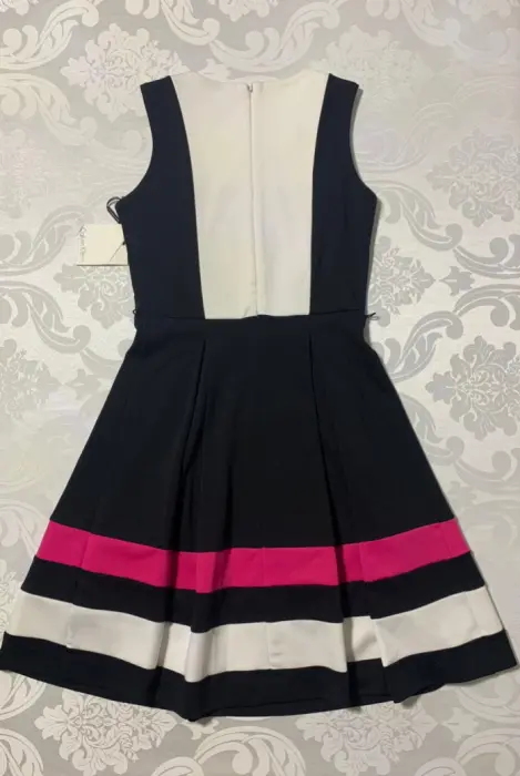 Hermoso vestido corte princesa, sin mangas, cuello redondo, cierre oculto en la espalda y con un delgado cinturón sintético.Tela de poliéster con rayón. (Estira con firmeza).Medidas/ espalda: 31 cm, cintura: 40 cm, cintura: cintura; 35 cm, cadera: 40 cm, largo: 93 cm.