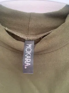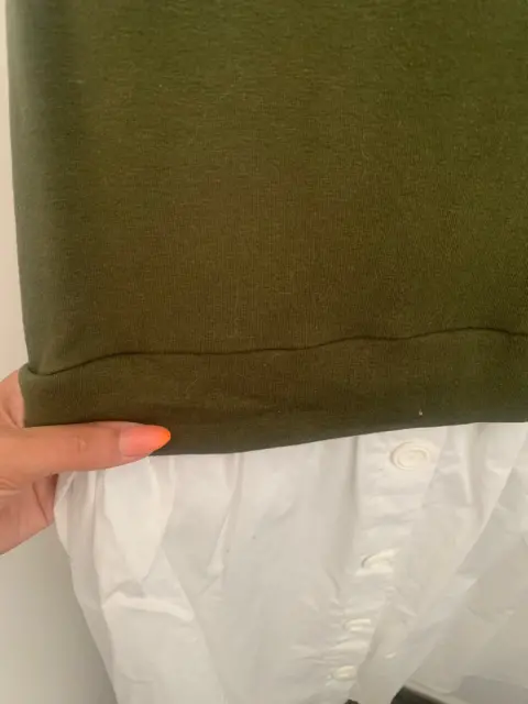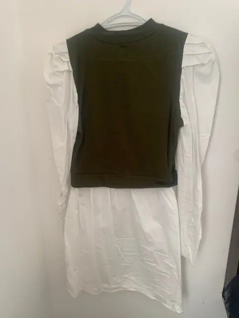 Vestido camisero blanco cn verde militar. Con manga larga y Hombro levantado, llega a la rodilla, en perfecto estado
