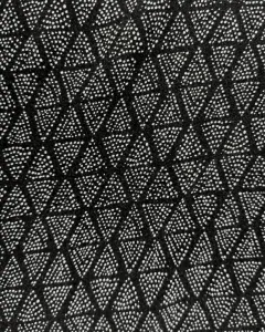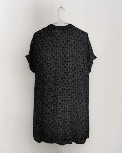 Vestido camisero tela suelta. Color negro con estampado en pequeños puntos blancos. Cuello mao, en V. Mangas cortas con valenciana. Muy amplio, línea A. Corte redondo. Talla S.