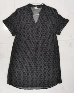Vestido camisero con estampado H&M. Vestido camisero tela suelta. Color negro con estampado en pequeños puntos blancos. Cuello mao, en V. Mangas cortas con valenciana. Muy amplio, línea A. Corte redondo. Talla S.