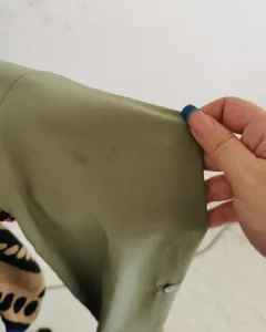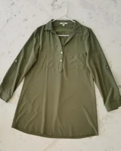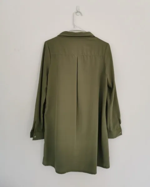 Vestido camisero, corte línea A. Color verde olivo. Mangas largas con botón y jareta para sostenerlas dobladas. Botones al pecho. 2 bolsillos de parche al frente. Cuello con solapa. Tiene una pequeña mancha en la manga. Talla L.
