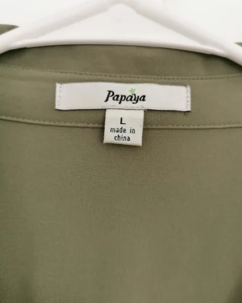 Vestido camisero Papaya. Vestido camisero, corte línea A. Color verde olivo. Mangas largas con botón y jareta para sostenerlas dobladas. Botones al pecho. 2 bolsillos de parche al frente. Cuello con solapa. Tiene una pequeña mancha en la manga. Talla L.