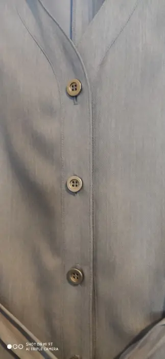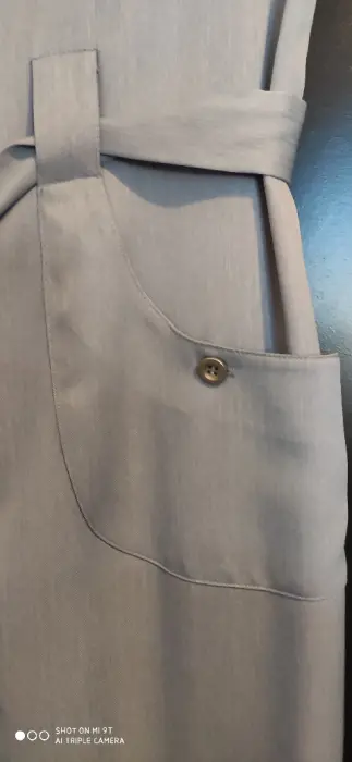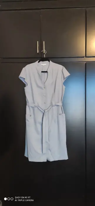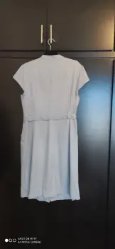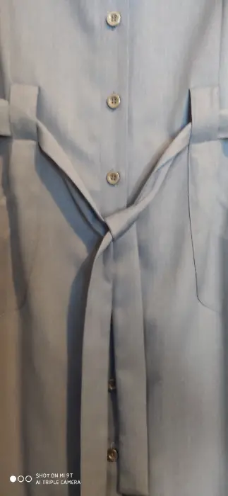 Hermoso vestido camisero en color azul claro, talla 38. Botones de metal, bolsas al frente, medidas llado a lado de: hombros 42 cm. Busto 54 cm. Cintura 51 cm. Cadera 63 cm. Largo del vestido 106 cm. Tomado desde el hombro.