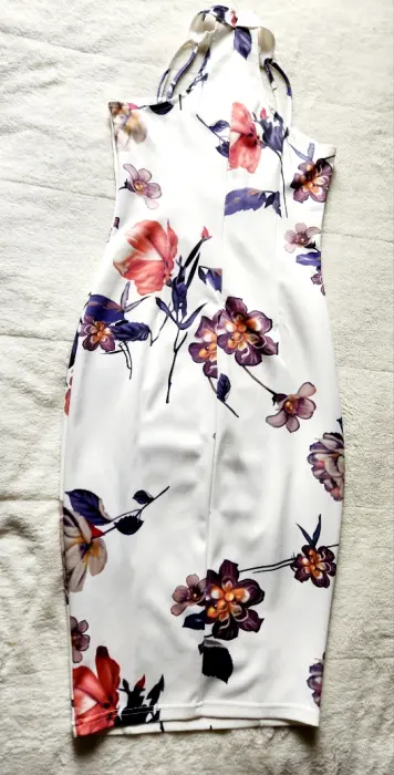 Vestido casual-formal, blanco con flores para primavera o evento en jardín o playa, tipo halter y escote con ahujeta. Tela estrech, entubado, hace silueta super linda.