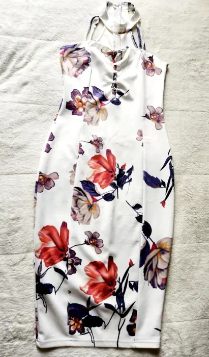 Vestido casial-formal. Vestido casual-formal, blanco con flores para primavera o evento en jardín o playa, tipo halter y escote con ahujeta. Tela estrech, entubado, hace silueta super linda.