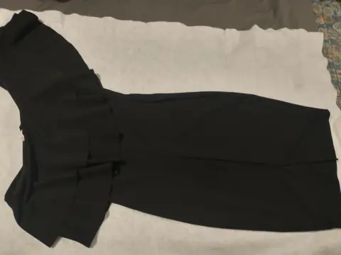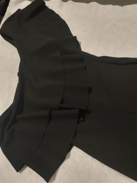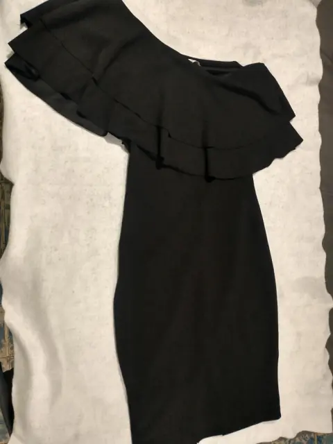 Vestido ala rodilla de tela elástica con olanes en los hombros talla L,con abertura en la falda en la parte de atrás.