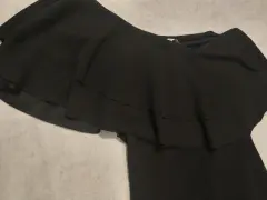 Vestido casual. Vestido ala rodilla de tela elástica con olanes en los hombros talla L,con abertura en la falda en la parte de atrás.