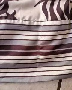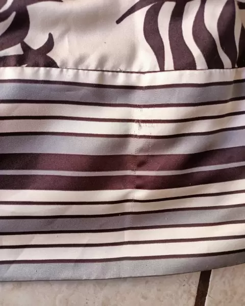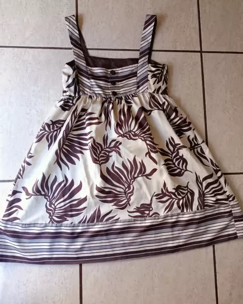 Vestido casual con tirantes grueso, estampado en flores y rayas cafe con beige. Talla L Ojo tiene un detalle en la parte de abajo, se corrio un poco pero de lejos no se nota.