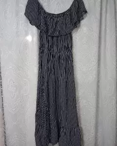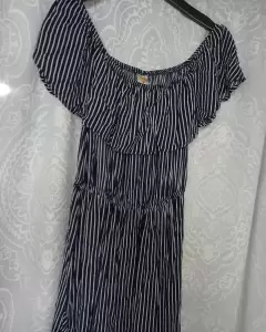 Vestido color azul intenso , y rayas blancas en talla 7, que sería mediana. Nuevo solo se utilizo una vez