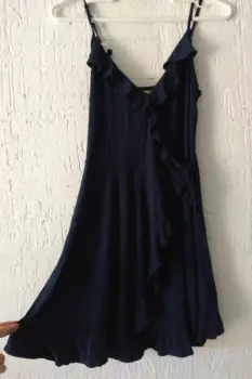 Vestido casual azul marino con olanes. Vestido casual azul marino con olanes.HollisterCintura 54cm pero se estira la tela.Largo 85cm del hombro hasta abajo95% algodon, 5% poliestilenoTiene un botón pequeño por dentro donde se une el pliego de en frente. Se ve en la foto. Pero cuando lo usas no se ve el botón. Solo lo ves si lo tienes puesto y miras hacia abajo.No tiene detalles. No tiene nada rotó ni manchas.