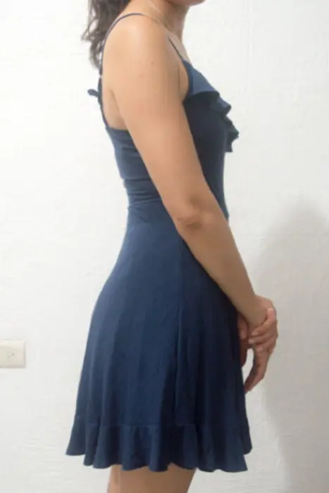 Vestido casual azul marino con olanes.HollisterCintura 54cm pero se estira la tela.Largo 85cm del hombro hasta abajo95% algodon, 5% poliestilenoTiene un botón pequeño por dentro donde se une el pliego de en frente. Se ve en la foto. Pero cuando lo usas no se ve el botón. Solo lo ves si lo tienes puesto y miras hacia abajo.No tiene detalles. No tiene nada rotó ni manchas.