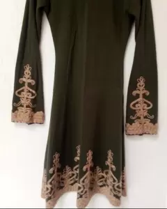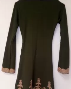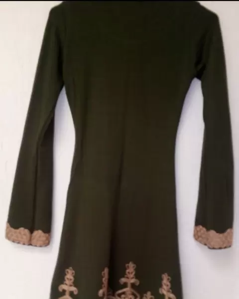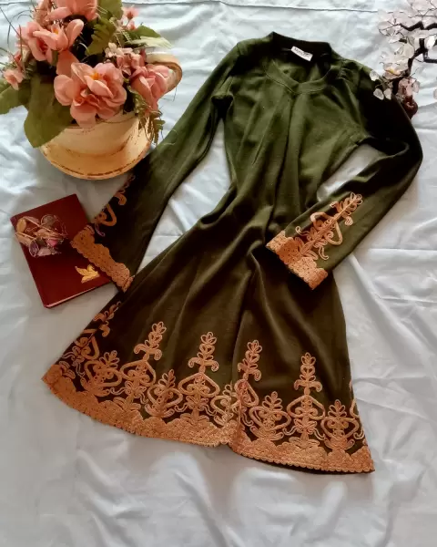Vestido casual bordado. Vestido corte A color verde, bordado color beige, cuello redondo, manga larga