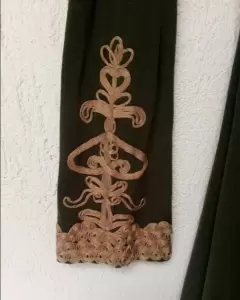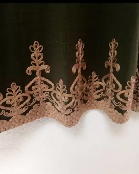 Vestido corte A color verde, bordado color beige, cuello redondo, manga larga