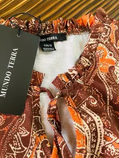 Vestido café con detalles en color naranja , con resorte en la cadera y falda volada, no es pegado