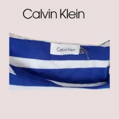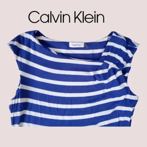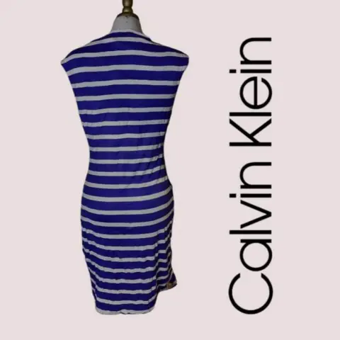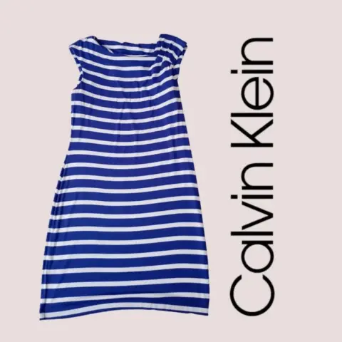Vestido casual Calvin Klein t M/G. Vestido franjas azul blanco cuello redondo, plisado en manga izquierda, talla 12 queda a M/G material 95% rayón 5% Spandex. 45cm hombros 49cm axila a axila 86cm cintura 104cm cadera