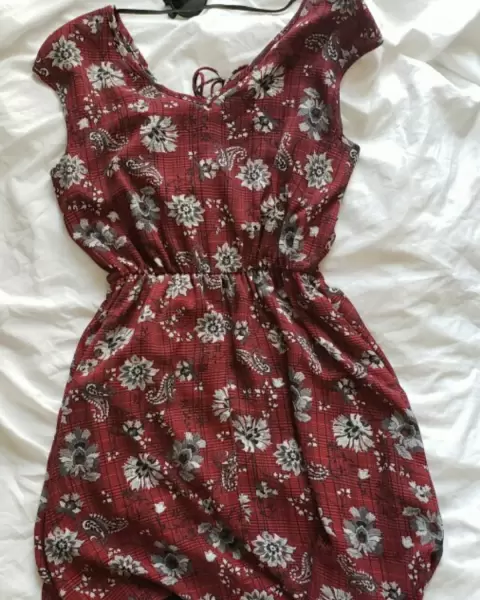 Vestido casual corto floreado. Vestido corto casual con agarre en cintura.Mis medidas son pecho: 95, cintura: 78, cadera: 108, mido 170 y me queda un poco abajo de nalgas. No tiene ningún detalle.