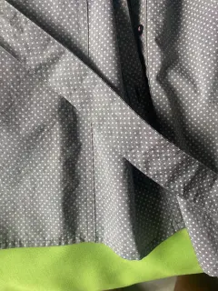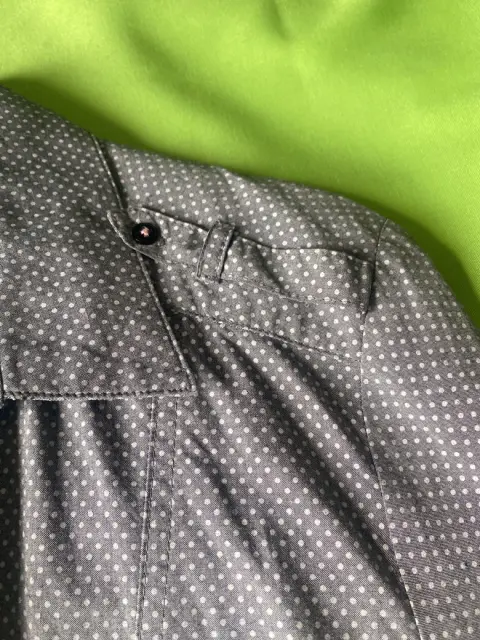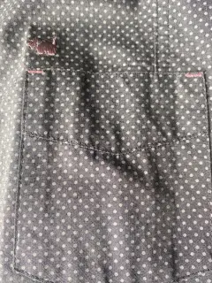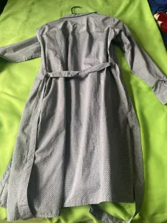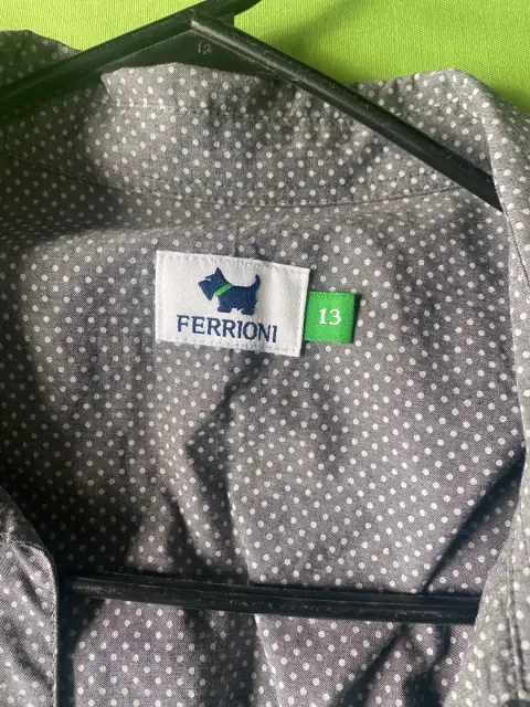 Vestido casual marca ferrioni coló gris con puntos blancos con apliques en rosa cierre a botones con lazo a la cintura llega larriba de la rodilla