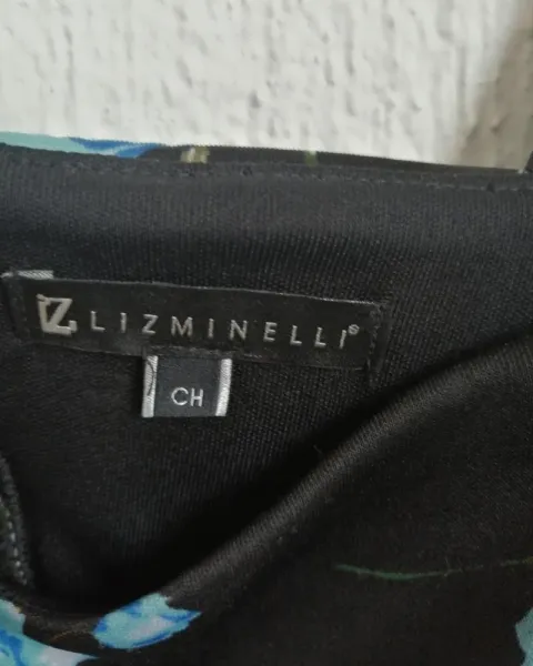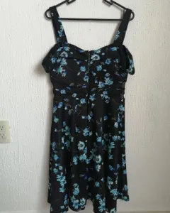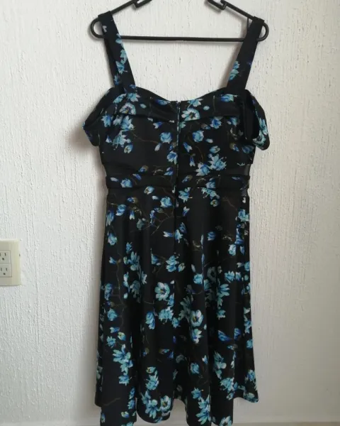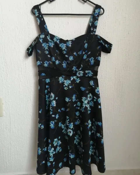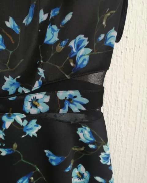 Vestido Casual de Dama Liz Minelli. Vestido Casual Talla chica, aunque viene un poco amplio puede dar a talla mediana, es color negro con estampado de flores en color azul, cuenta con transparencia en la parte de en medio y doble tirante, el segundo se usa como timo manga caída.