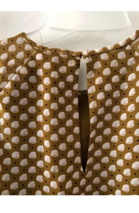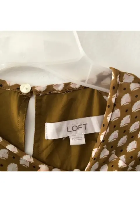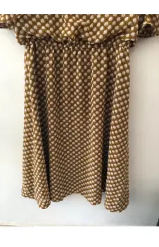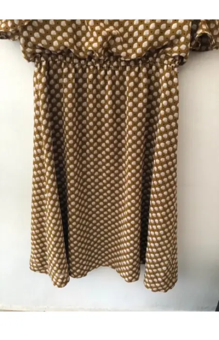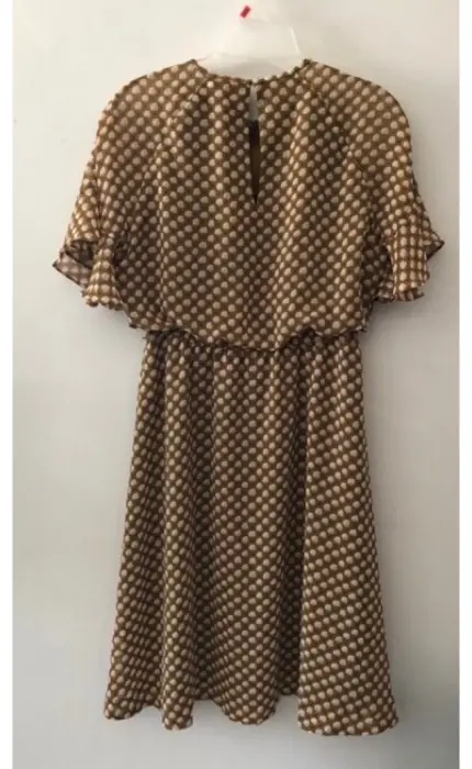 Hermoso vestido primaveral. Talla Xs pero también queda a una S. Elegante y fresco, tela de casa con forro, cintura elástica, hombro caído y manga tipo capa. El color es café clarito con figuritas en color rosa bebé y blanco y puntitos negros. Esta bellísimo
