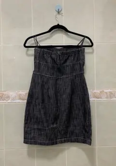 Vestido de mezclilla, corte princesa, straple, talla 5, queda de una chica a mediana. Cierre en la espalda y resorte horizontal en el inicio del straple trasero. Medidas- Busto: 36 cm, cintura: 35 cm, largo: 65 cm.