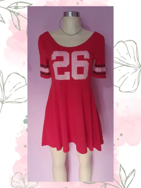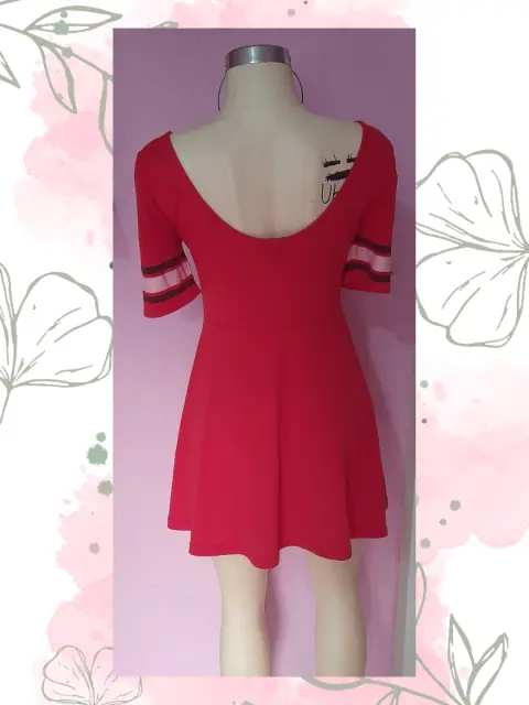 Es un vestido casual color rojo estampado en el frente y en los puños de las mangas, el largo es arriba de la rodilla y el escote es a los hombros con mangas a 3/4. No recuerdo cual es la marca porque con el tiempo se borro de la etiqueta pero esta en muy buen estado es estampado esta en excelentes condiciones.