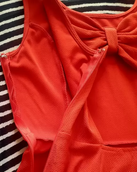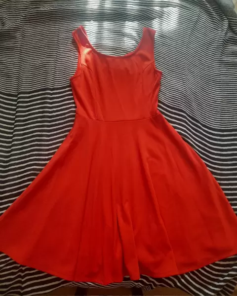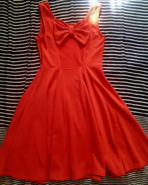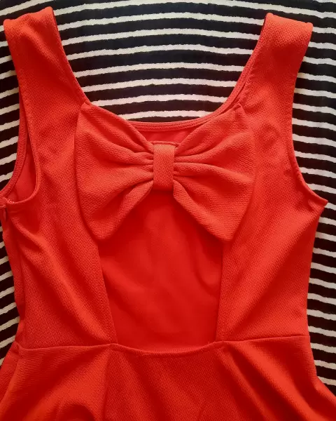 Hermoso vestido naranja, arriba de la rodilla, puede ser casual o formal, en la parte de atrás tiene escote y un moño muy lindo.MedidasLargo: 86 cmCintura: 31cmAmplio de la faldaSi tienes alguna duda estoy para ayudarte.